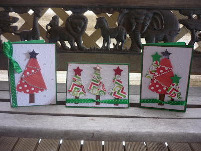 Heres some simple Christmas cards. They are lots of fun to make and so easy. It is using the folded Christmas tree technique. Ive made this set up myself for my ladies to do at the card making workshop. I hope they like them :D